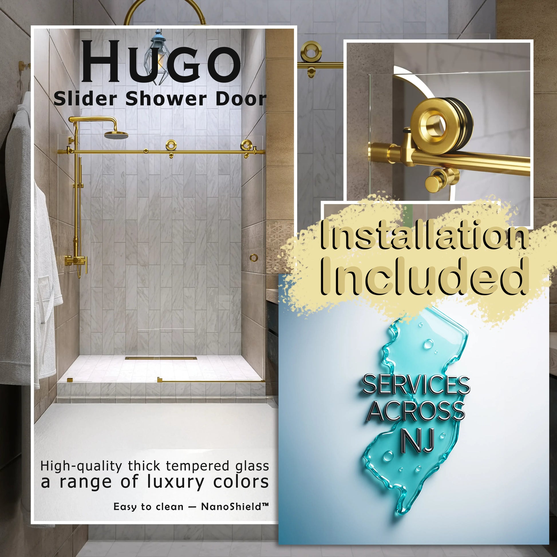 Hugo Satin Gold Sliding Shower Door including Installation (NJ)