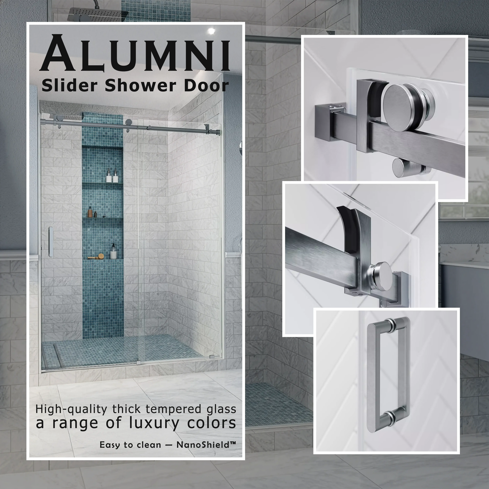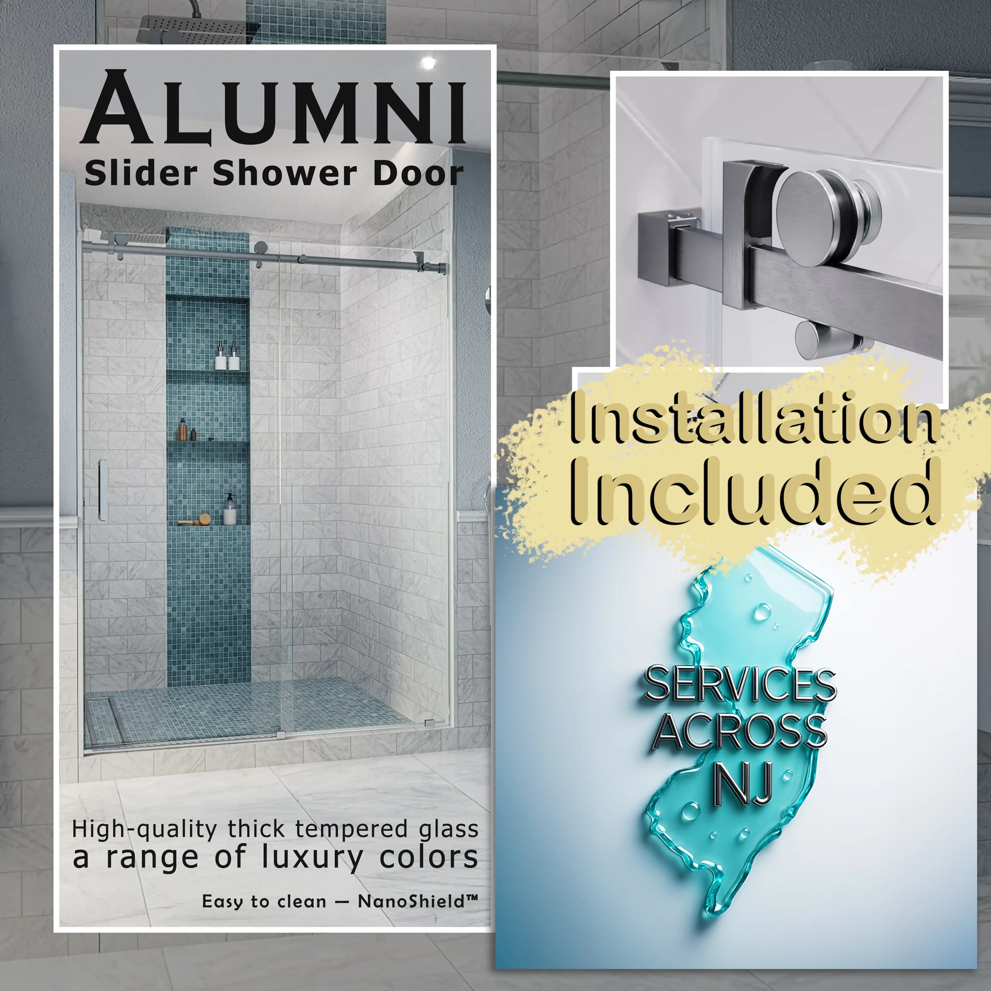 Upgrade your bathroom with the Alumni Brushed Stainless sliding shower door and professional installation in New Jersey. Includes 3/8" clear tempered glass, brushed stainless hardware, smooth-glide rollers, delivery, expert install, and a free 6-month service. Available sizes from 44-48 in. to 56–60 in. W × 76 in. H.